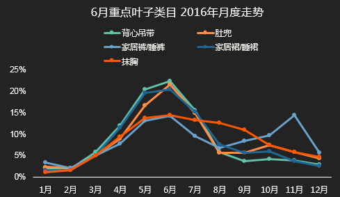 背心吊带、肚兜和家居服:这类产品的销售周期很短,在6月达到销售峰值,7月就将大幅度下滑,对于这一类的应季产品在备货时需要慎重,以免备货过多而滞销。商家可以适当的通过打折刺激销售,抓住6月的市场热度尽可能多的去化库存,减少之后的清仓压力。