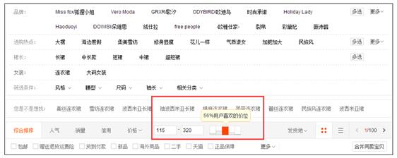 比如这个连衣裙,115——320元是一个价格档次(这里指的是销售价格,而不是一口价),然后如果你的商品既有这个区间内的,又有这个区间外的,那么就是属于价格混乱了。同样的,在一些重要属性上,比如风格,如果你既有韩版的、又有民族风的,那么就属于标签不明确,这样的店铺得到免费的自然搜索的机会将会越来越少。当然,你不要跟我抬杠,现在XX店铺就是什么都卖,也不错!