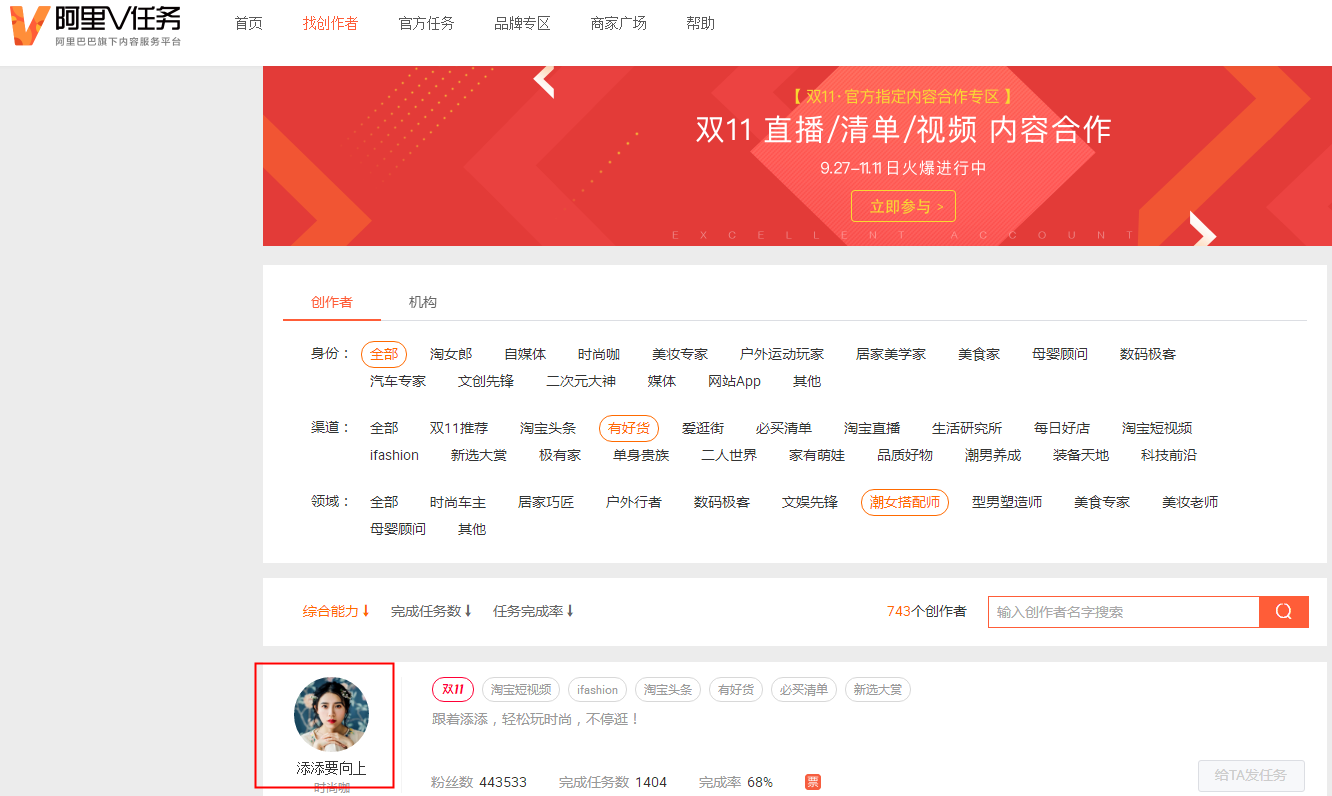 打开网址之后,我们会来到一个阿里v任务。在这里,如果你是商家,你可以在这里去找达人,帮你的宝贝做一些展现,帮你去引流。如果你是达人的话,可以在这里进行招募商家,帮他们去做推广。在这里有哦很多的推广方式,比如淘宝达人、爱逛街等。内容形式和达人领域我们都可以去选择。那怎么样才能找到达人呢?看你自己需要从哪一个端口引来流量,比如想在有货里面得到展示,那就可以在首页按渠道查找“有好货”,点击进入之后,选择你的领域,下面就会有很多的达人,