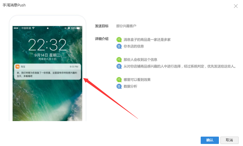 这里会用到客户运营平台中的智能营销,兴趣客户转化,针对近期3-10天有加购收藏,但是最近10天没有成交的客户,进行优惠券、短信和定向海报的营销组合投放。其实使用兴趣客户投放的目的有两点。1.这类人群肯定是需求产品人群 2.他有手淘push投放方式。(不理解的同学看下图)手机弹窗的触及率可是很高的。